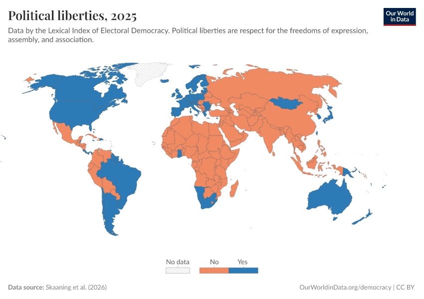 Skaaning et al. (2025) – processed by Our World in Data. “Political liberties” [dataset]. Skaaning et al., “Lexical Index of Electoral Democracy (LIED) v6.8” [original data]. Retrieved January 9, 2026 from https://chrome-plugin.owid.pages.dev/grapher/political-liberties-lexical