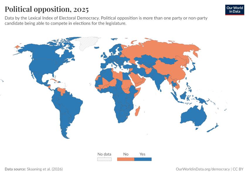 Skaaning et al. (2025) – processed by Our World in Data. “Political opposition” [dataset]. Skaaning et al., “Lexical Index of Electoral Democracy (LIED) v6.8” [original data]. Retrieved January 9, 2026 from https://chrome-plugin.owid.pages.dev/grapher/political-opposition-lexical