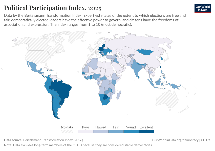 “Data Page: Political Participation Index”, part of the following publication: Bastian Herre, Lucas Rodés-Guirao, and Esteban Ortiz-Ospina (2013) - “Democracy”. Data adapted from Bertelsmann Transformation Index. Retrieved from https://chrome-plugin.owid.pages.dev/grapher/political-participation-index-bti [online resource]How to cite this data