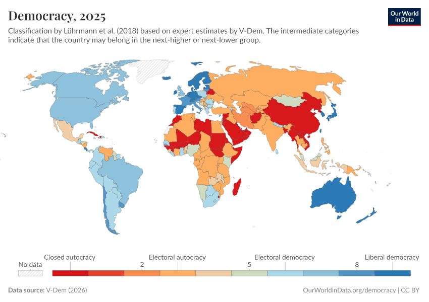 V-Dem (2025) – processed by Our World in Data. “Political regime – inc. ambiguous categories” [dataset]. V-Dem, “Democracy report v15” [original data]. Retrieved January 9, 2026 from https://chrome-plugin.owid.pages.dev/grapher/political-regime-amb-row