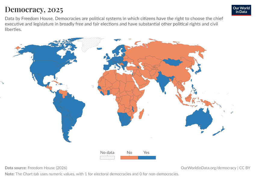 Freedom House (2025) – processed by Our World in Data. “Democracy” [dataset]. Freedom House, “Freedom in the World” [original data]. Retrieved January 9, 2026 from https://chrome-plugin.owid.pages.dev/grapher/political-regime-dem-fh