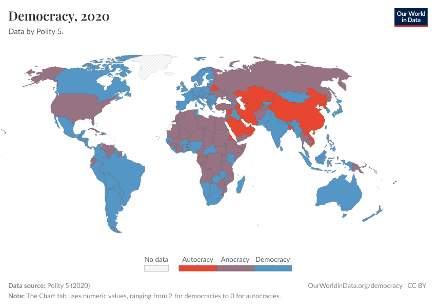 “Data Page: Democracy”, part of the following publication: Bastian Herre, Lucas Rodés-Guirao, and Esteban Ortiz-Ospina (2013) - “Democracy”. Data adapted from Polity 5. Retrieved from https://chrome-plugin.owid.pages.dev/grapher/political-regime-polity [online resource]How to cite this data