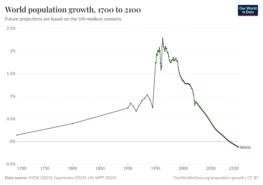 “Data Page: World population growth”, part of the following publication: Hannah Ritchie, Lucas Rodés-Guirao, Edouard Mathieu, Marcel Gerber, Esteban Ortiz-Ospina, Joe Hasell, and Max Roser (2023) - “Population Growth”. Data adapted from PBL Netherlands Environmental Assessment Agency, Gapminder, United Nations. Retrieved from https://chrome-plugin.owid.pages.dev/grapher/population-growth-rate [online resource]How to cite this data
