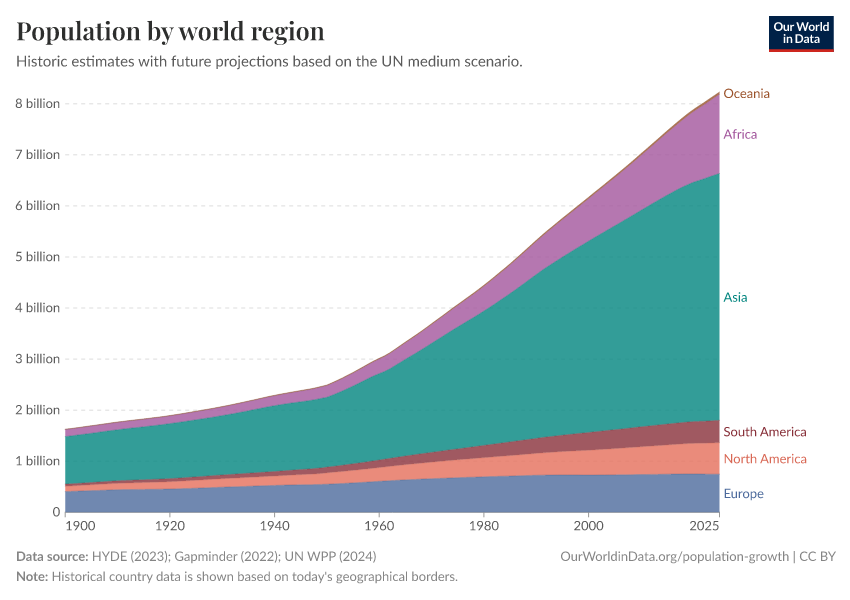 “Data Page: Population by world region”, part of the following publication: Hannah Ritchie, Lucas Rodés-Guirao, Edouard Mathieu, Marcel Gerber, Esteban Ortiz-Ospina, Joe Hasell, and Max Roser (2023) - “Population Growth”. Data adapted from PBL Netherlands Environmental Assessment Agency, Gapminder, United Nations. Retrieved from https://chrome-plugin.owid.pages.dev/grapher/population-regions-with-projections [online resource]How to cite this data