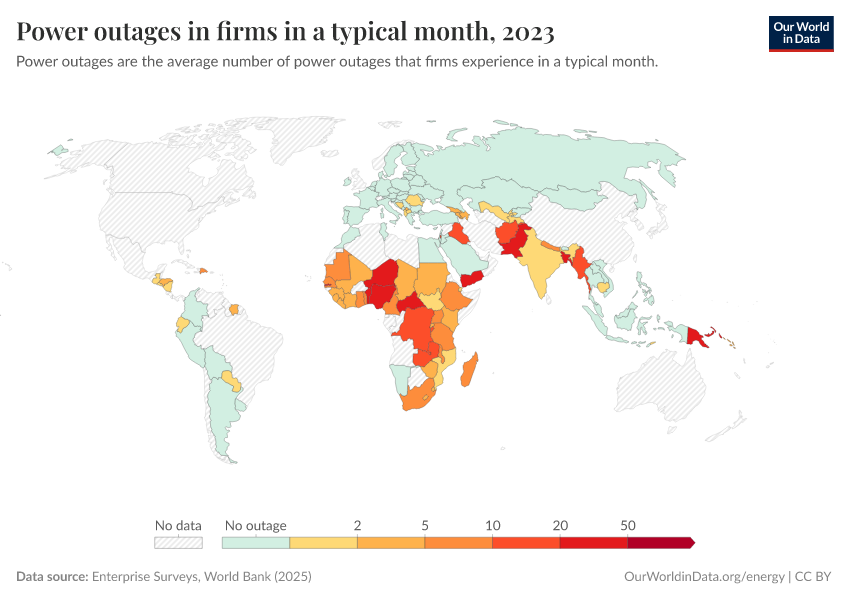 “Data Page: Power outages in firms in a typical month”. Our World in Data (2026). Data adapted from Enterprise Surveys, World Bank. Retrieved from https://chrome-plugin.owid.pages.dev/grapher/power-outages-in-firms-per-month [online resource]