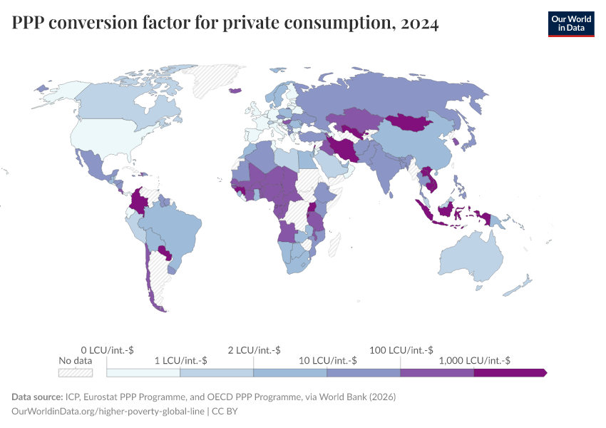 “Data Page: PPP conversion factor for private consumption”. Our World in Data (2026). Data adapted from ICP, Eurostat PPP Programme, and OECD PPP Programme, via World Bank. Retrieved from https://chrome-plugin.owid.pages.dev/grapher/ppp-conversion-factor-for-private-consumption [online resource]How to cite this data