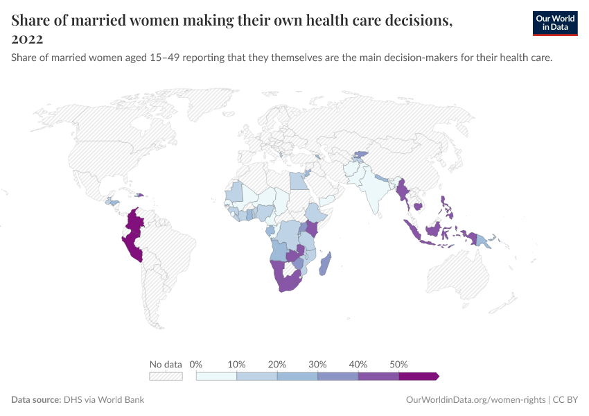 DHS via World Bank – processed by Our World in Data. “Share of married women making their own health care decisions” [dataset]. World Bank Gender Statistics, “World Bank Gender Statistics” [original data]. Retrieved January 9, 2026 from https://chrome-plugin.owid.pages.dev/grapher/proportion-of-women-who-make-their-own-informed-health-care-decisions