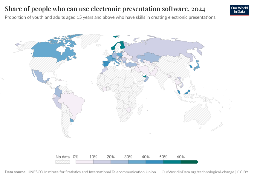 UNESCO Institute for Statistics and International Telecommunication Union – processed by Our World in Data. “Share of people who can use electronic presentation software” [dataset]. UNESCO Institute for Statistics and International Telecommunication Union, “Data from multiple sources” [original data]. Retrieved January 9, 2026 from https://chrome-plugin.owid.pages.dev/grapher/proportion-with-ict-skills-in-presentations