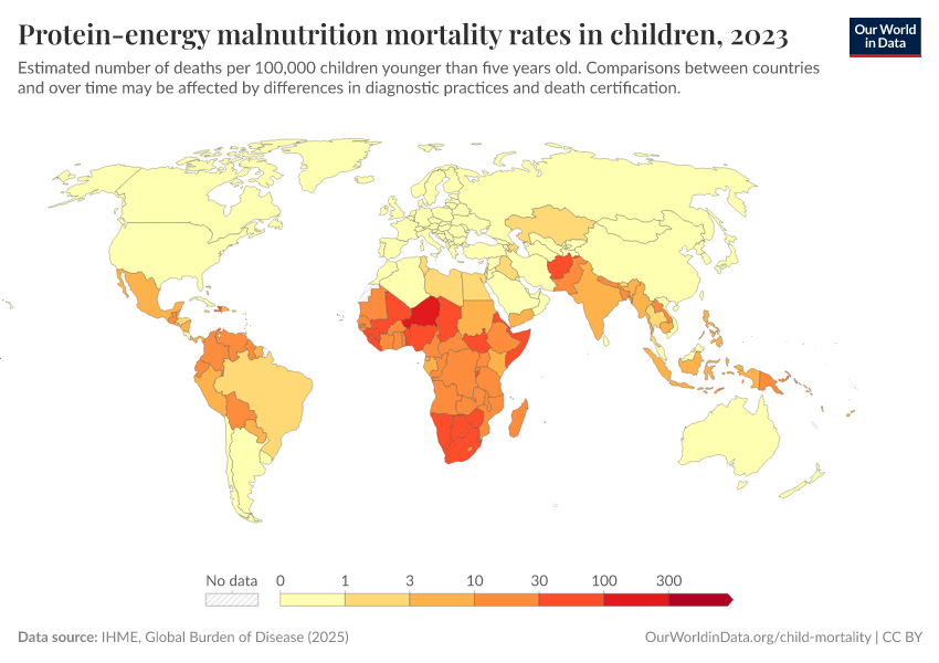IHME, Global Burden of Disease (2024) – with minor processing by Our World in Data. “Protein-energy malnutrition mortality rates in children ” [dataset]. IHME, Global Burden of Disease, “Global Burden of Disease - Deaths and DALYs” [original data]. Retrieved January 9, 2026 from https://chrome-plugin.owid.pages.dev/grapher/protein-energy-malnutrition-mortality-rates-in-children