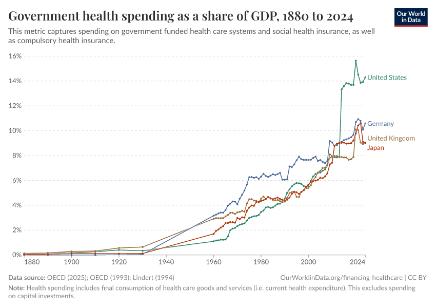 OECD (2025); OECD (1993); Lindert (1994) – with major processing by Our World in Data. “Public health expenditure as a share of GDP – Lindert, OECD – Historical data” [dataset]. OECD, “OECD Health Expenditure and Financing Database”; OECD, “OECD Health Systems”; Lindert, “The rise of social spending (1880-1930)” [original data]. Retrieved January 9, 2026 from https://chrome-plugin.owid.pages.dev/grapher/public-health-expenditure-share-gdp