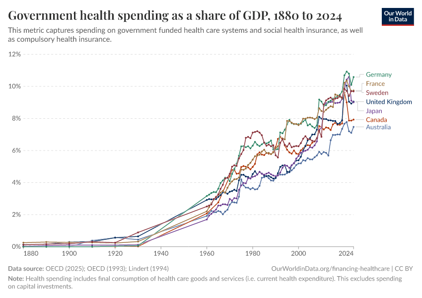 OECD (2025); OECD (1993); Lindert (1994) – with major processing by Our World in Data. “Public health expenditure as a share of GDP – Lindert, OECD – Historical data” [dataset]. OECD, “OECD Health Expenditure and Financing Database”; OECD, “OECD Health Systems”; Lindert, “The rise of social spending (1880-1930)” [original data]. Retrieved January 9, 2026 from https://chrome-plugin.owid.pages.dev/grapher/public-health-expenditure-share-gdp