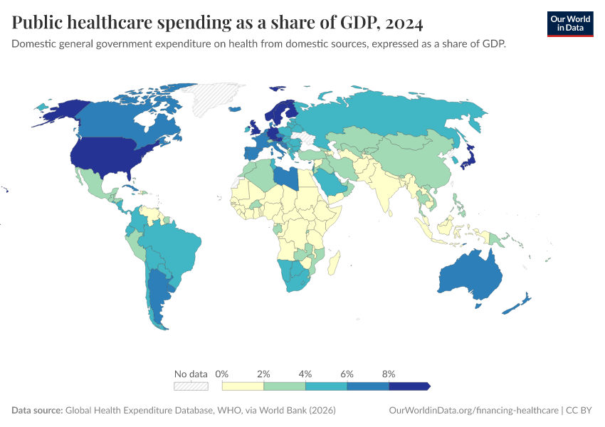 “Data Page: Public healthcare spending as a share of GDP”. Our World in Data (2026). Data adapted from World Health Organization (WHO), via World Bank. Retrieved from https://chrome-plugin.owid.pages.dev/grapher/public-healthcare-spending-share-gdp [online resource]How to cite this data