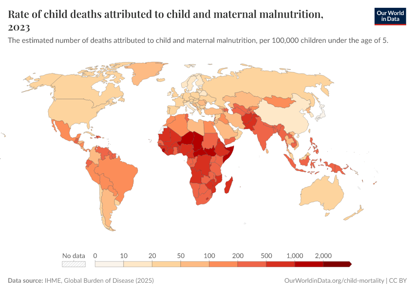 IHME, Global Burden of Disease (2024) – with minor processing by Our World in Data. “Rate of child deaths attributed to child and maternal malnutrition” [dataset]. IHME, Global Burden of Disease, “Global Burden of Disease - Risk Factors” [original data]. Retrieved January 9, 2026 from https://chrome-plugin.owid.pages.dev/grapher/rate-of-child-deaths-attributed-to-child-and-maternal-malnutrition