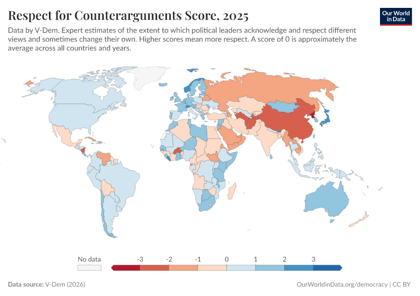 “Data Page: Respect for counterarguments”, part of the following publication: Bastian Herre, Lucas Rodés-Guirao, and Esteban Ortiz-Ospina (2013) - “Democracy”. Data adapted from V-Dem. Retrieved from https://chrome-plugin.owid.pages.dev/grapher/respect-for-counterarguments-score [online resource]How to cite this data