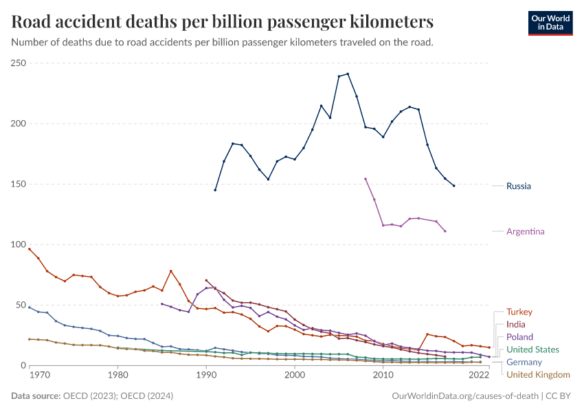 “Data Page: Road accident deaths per billion passenger kilometers”, part of the following publication: Hannah Ritchie and Max Roser (2021) - “Transport”. Data adapted from OECD. Retrieved from https://chrome-plugin.owid.pages.dev/grapher/road-accident-deaths-per-passenger-kilometers [online resource]How to cite this data