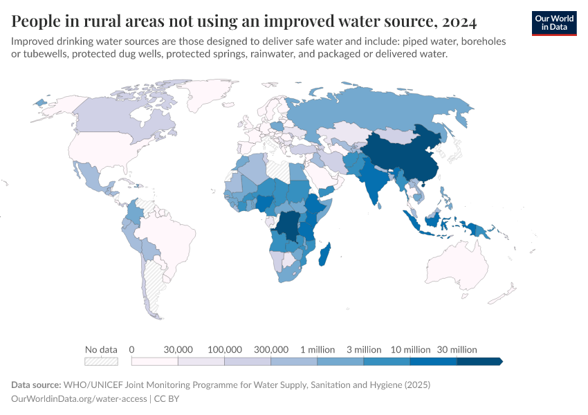 WHO/UNICEF Joint Monitoring Programme for Water Supply, Sanitation and Hygiene (JMP) (2024) – with major processing by Our World in Data. “People in rural areas not using an improved water source” [dataset]. WHO/UNICEF Joint Monitoring Programme for Water Supply, Sanitation and Hygiene (JMP), “WHO/UNICEF Joint Monitoring Programme for Water Supply, Sanitation and Hygiene (JMP) - Households”; WHO/UNICEF Joint Monitoring Programme for Water Supply, Sanitation and Hygiene (JMP), “WHO/UNICEF Joint Monitoring Programme for Water Supply, Sanitation and Hygiene (JMP) - Households - Regions” [original data]. Retrieved January 9, 2026 from https://chrome-plugin.owid.pages.dev/grapher/rural-without-improved-water