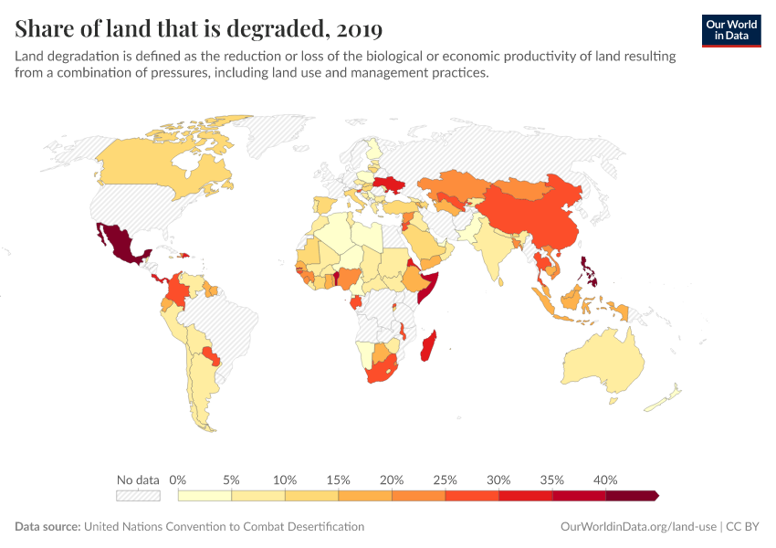 “Data Page: Share of land that is degraded”. Our World in Data (2026). Data adapted from United Nations Convention to Combat Desertification. Retrieved from https://chrome-plugin.owid.pages.dev/grapher/share-degraded-land [online resource]How to cite this data
