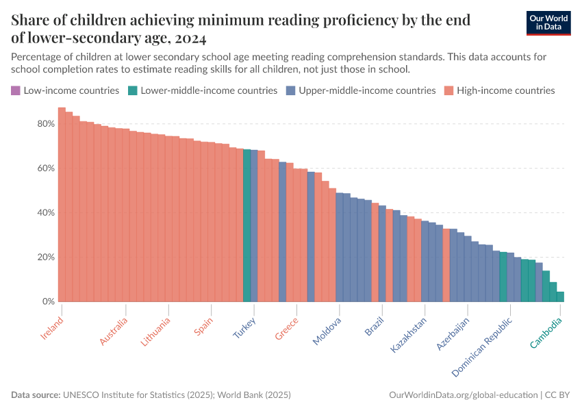 “Data Page: Share of children achieving minimum reading proficiency by the end of lower secondary age”, part of the following publication: Hannah Ritchie, Veronika Samborska, Natasha Ahuja, Esteban Ortiz-Ospina, and Max Roser (2023) - “Global Education”. Data adapted from UNESCO Institute for Statistics. Retrieved from https://chrome-plugin.owid.pages.dev/grapher/share-of-children-reaching-sufficient-reading-comprehension-by-the-end-of-lower-secondary-age [online resource]How to cite this data