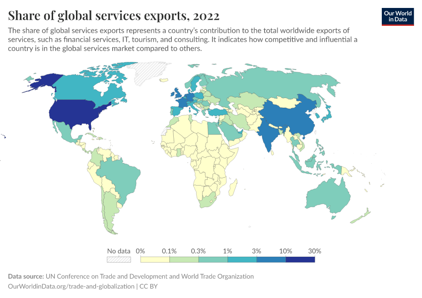 “Data Page: Share of global services exports”. Our World in Data (2026). Data adapted from UN Conference on Trade and Development and World Trade Organization. Retrieved from https://chrome-plugin.owid.pages.dev/grapher/share-of-global-services-exports [online resource]How to cite this data