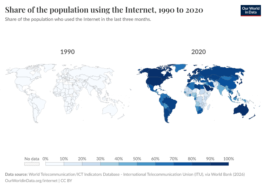 International Telecommunication Union (ITU), via World Bank (2025) – with minor processing by Our World in Data. “Share of the population using the Internet – International Telecommunication Union” [dataset]. International Telecommunication Union (ITU), via World Bank, “World Development Indicators” [original data]. Retrieved January 9, 2026 from https://chrome-plugin.owid.pages.dev/grapher/share-of-individuals-using-the-internet