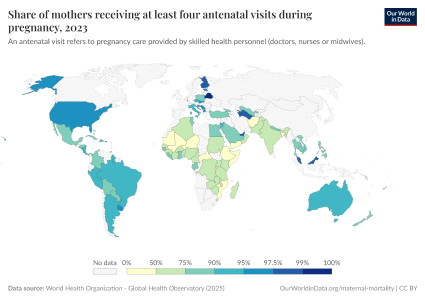 “Data Page: Share of mothers receiving at least four antenatal visits during pregnancy”. Our World in Data (2026). Data adapted from World Health Organization. Retrieved from https://chrome-plugin.owid.pages.dev/grapher/share-of-mothers-receiving-at-least-four-antenatal-visits-during-pregnancy [online resource]How to cite this data