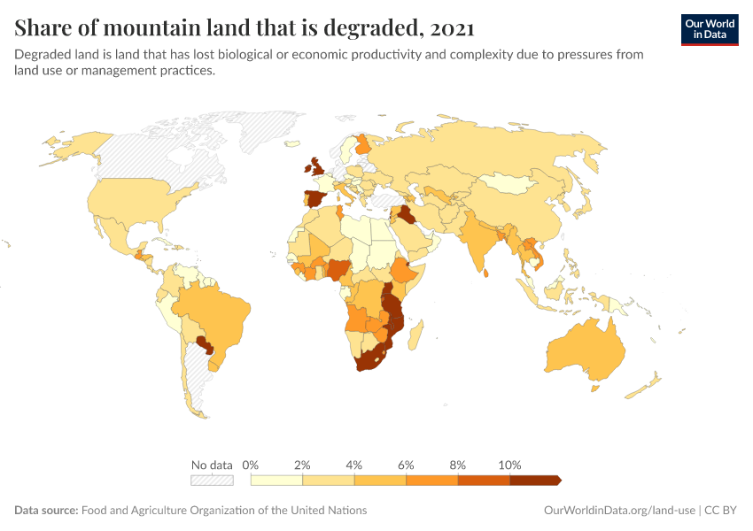 Food and Agriculture Organization of the United Nations – processed by Our World in Data. “Share of mountain land that is degraded” [dataset]. Food and Agriculture Organization of the United Nations, “Food and Agriculture Organization of the United Nations (FAO), South African National Biodiversity Institute (SANBI), Instituto Brasileiro de Geografia e Estatística (IBGE)” [original data]. Retrieved January 9, 2026 from https://chrome-plugin.owid.pages.dev/grapher/share-of-mountain-land-that-is-degraded