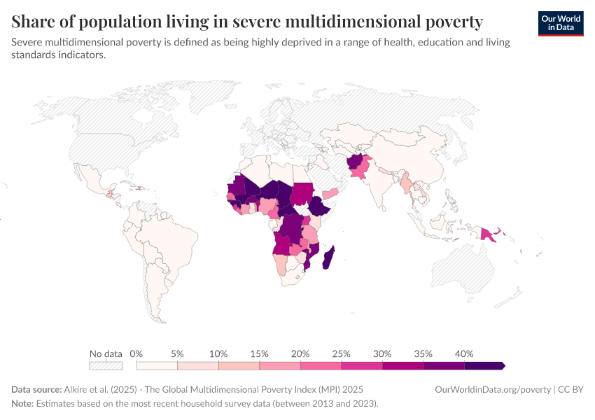 “Data Page: Share of population living in severe multidimensional poverty”, part of the following publication: Joe Hasell, Bertha Rohenkohl, Pablo Arriagada, Esteban Ortiz-Ospina, and Max Roser (2022) - “Poverty”. Data adapted from Alkire, Kanagaratnam and Suppa. Retrieved from https://chrome-plugin.owid.pages.dev/grapher/share-of-population-in-severe-multidimensional-poverty [online resource]How to cite this data