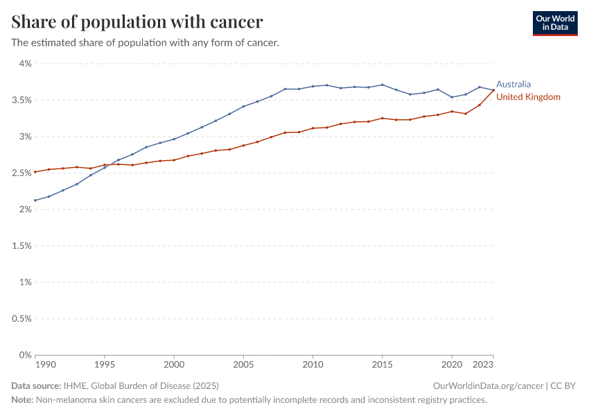 IHME, Global Burden of Disease (2024) – with major processing by Our World in Data. “Share of population with cancer” [dataset]. IHME, Global Burden of Disease, “Global Burden of Disease - Prevalence and Incidence” [original data]. Retrieved January 9, 2026 from https://chrome-plugin.owid.pages.dev/grapher/share-of-population-with-cancer-crude