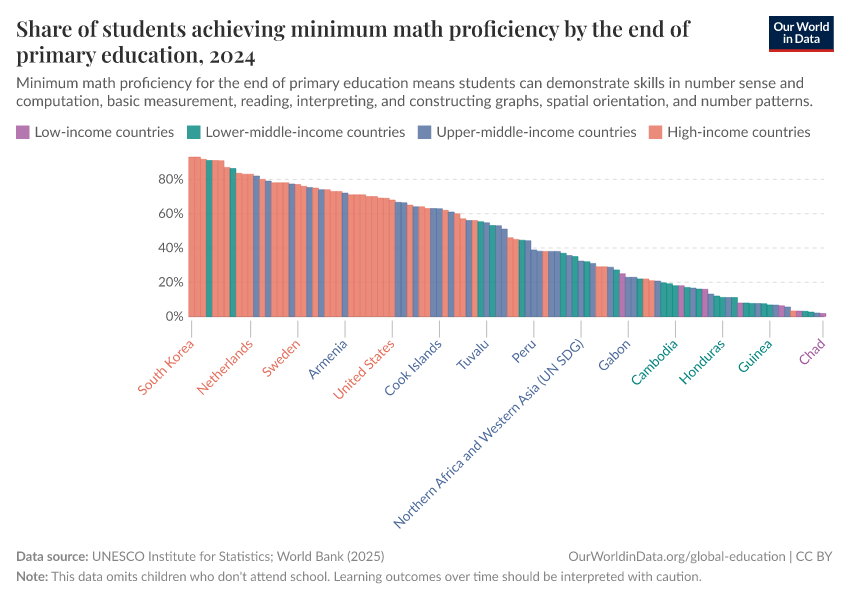 “Data Page: Share of students achieving minimum math proficiency by the end of primary education”. Our World in Data (2026). Data adapted from UNESCO Institute for Statistics. Retrieved from https://chrome-plugin.owid.pages.dev/grapher/share-of-students-at-end-of-primary-education-achieving-minimum-math-proficiency [online resource]How to cite this data