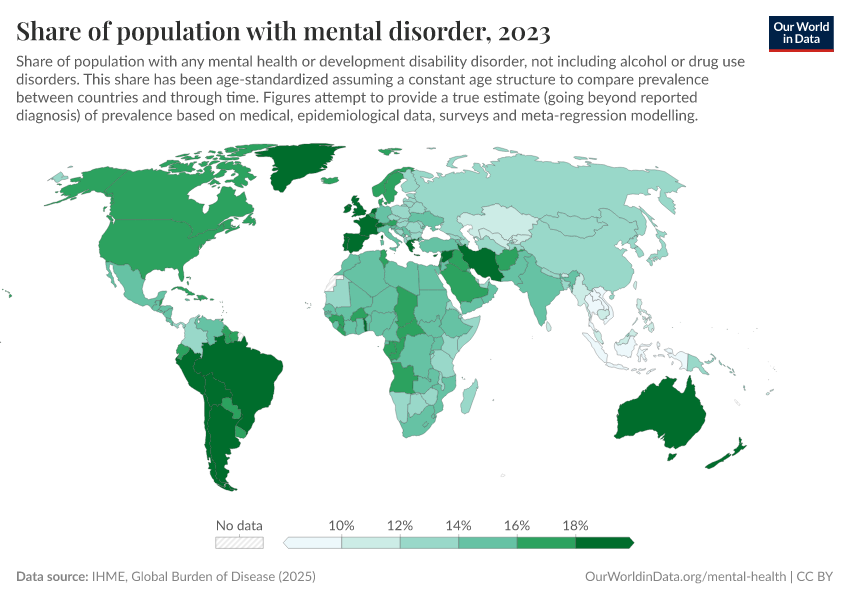 IHME, Global Burden of Disease (2024) – with major processing by Our World in Data. “Share of population with mental disorder” [dataset]. IHME, Global Burden of Disease, “Global Burden of Disease - Mental Health Prevalence” [original data]. Retrieved January 9, 2026 from https://chrome-plugin.owid.pages.dev/grapher/share-with-mental-health-or-development-disorder