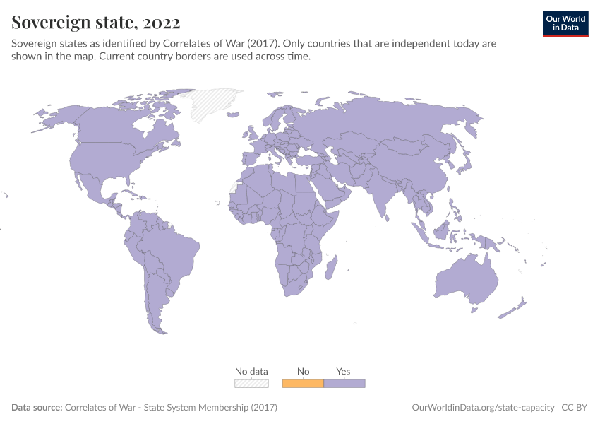 “Data Page: Sovereign state”, part of the following publication: Bastian Herre and Pablo Arriagada (2023) - “State Capacity”. Data adapted from Correlates of War. Retrieved from https://chrome-plugin.owid.pages.dev/grapher/sovereign-state-cow [online resource]How to cite this data