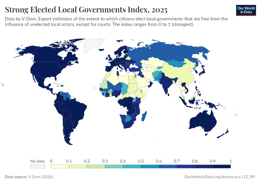 V-Dem (2025) – processed by Our World in Data. “Elected local governments – V-Dem” [dataset]. V-Dem, “Democracy report v15” [original data]. Retrieved January 9, 2026 from https://chrome-plugin.owid.pages.dev/grapher/strong-elected-local-governments-index
