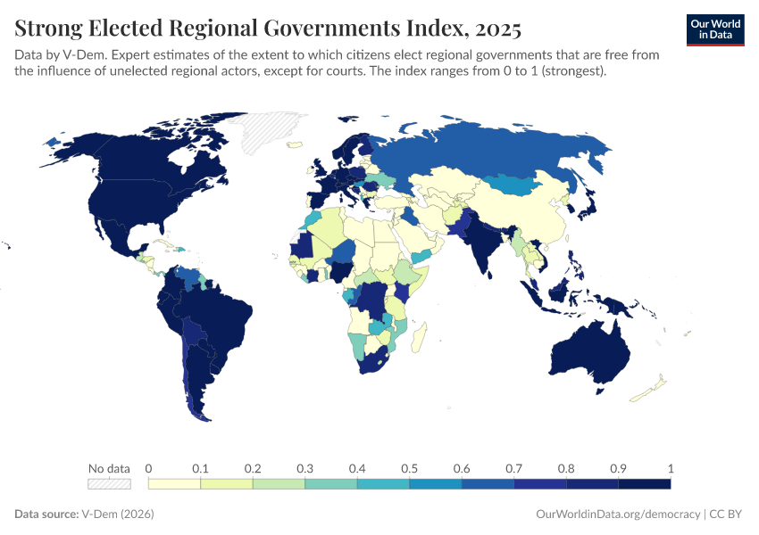 V-Dem (2025) – processed by Our World in Data. “Elected regional governments – V-Dem” [dataset]. V-Dem, “Democracy report v15” [original data]. Retrieved January 9, 2026 from https://chrome-plugin.owid.pages.dev/grapher/strong-elected-regional-governments-index