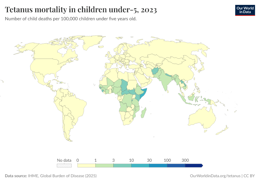 IHME, Global Burden of Disease (2024) – with minor processing by Our World in Data. “Tetanus mortality in children under-5” [dataset]. IHME, Global Burden of Disease, “Global Burden of Disease - Deaths and DALYs” [original data]. Retrieved January 9, 2026 from https://chrome-plugin.owid.pages.dev/grapher/tetanus-mortality-in-children-under-5