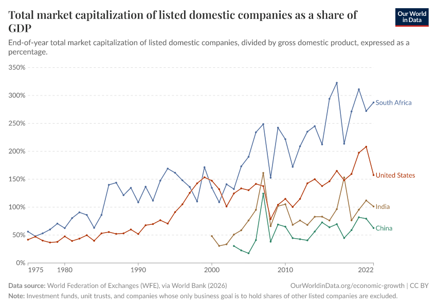 “Data Page: Total market capitalization of listed domestic companies as a share of GDP”. Our World in Data (2026). Data adapted from World Federation of Exchanges (WFE), via World Bank. Retrieved from https://chrome-plugin.owid.pages.dev/grapher/total-market-capitalization-listed-domestic-companies-share-gdp [online resource]How to cite this data