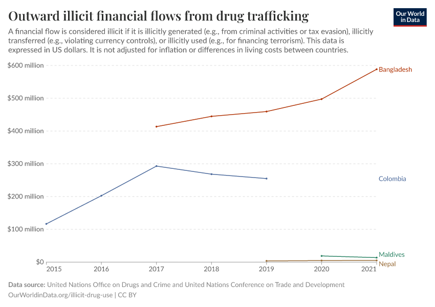 United Nations Office on Drugs and Crime and United Nations Conference on Trade and Development – processed by Our World in Data. “Outward illicit financial flows from drug trafficking” [dataset]. United Nations Office on Drugs and Crime and United Nations Conference on Trade and Development, “Data from multiple sources” [original data]. Retrieved January 9, 2026 from https://chrome-plugin.owid.pages.dev/grapher/total-outward-financial-flows-from-drug-trafficking