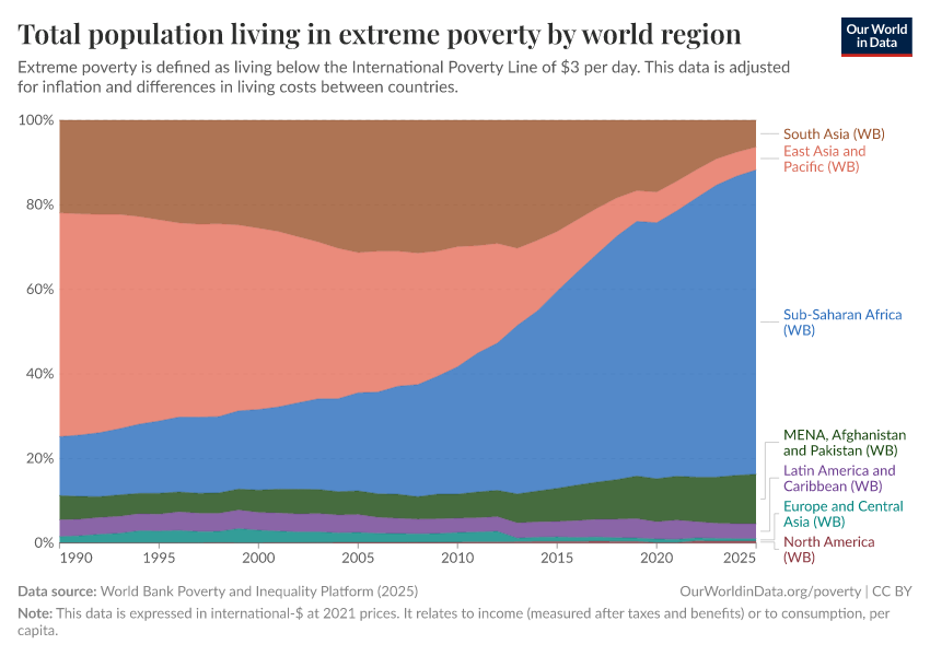 World Bank Poverty and Inequality Platform (2025) – with major processing by Our World in Data. “Total population living in extreme poverty by world region – World Bank” [dataset]. World Bank Poverty and Inequality Platform, “World Bank Poverty and Inequality Platform (PIP) 20250930_2021, 20250930_2017” [original data]. Retrieved January 9, 2026 from https://chrome-plugin.owid.pages.dev/grapher/total-population-living-in-extreme-poverty-by-world-region