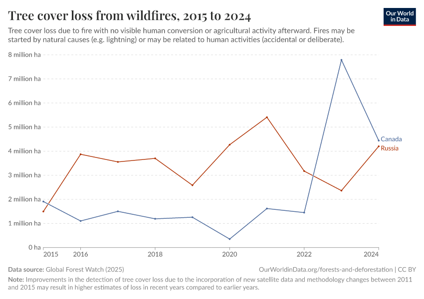 “Data Page: Tree cover loss from wildfires”, part of the following publication: Hannah Ritchie, Fiona Spooner, and Max Roser (2021) - “Forests and Deforestation”. Data adapted from Global Forest Watch. Retrieved from https://chrome-plugin.owid.pages.dev/grapher/tree-cover-loss-from-wildfires [online resource]How to cite this data