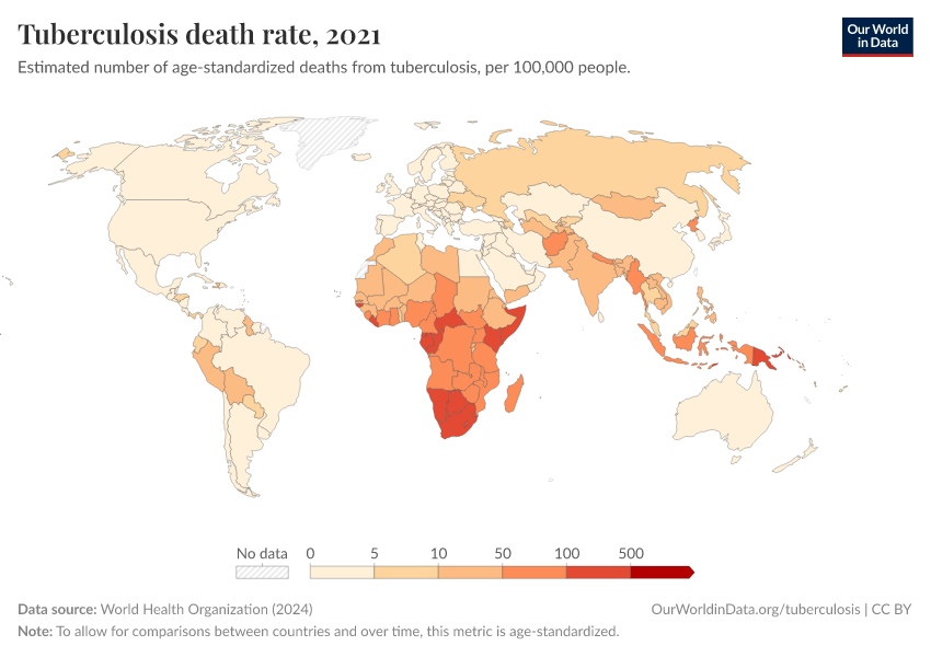 World Health Organization (2024) – with major processing by Our World in Data. “Tuberculosis death rate” [dataset]. World Health Organization, “Global Health Estimates” [original data]. Retrieved January 9, 2026 from https://chrome-plugin.owid.pages.dev/grapher/tuberculosis-death-rate-age-standardized