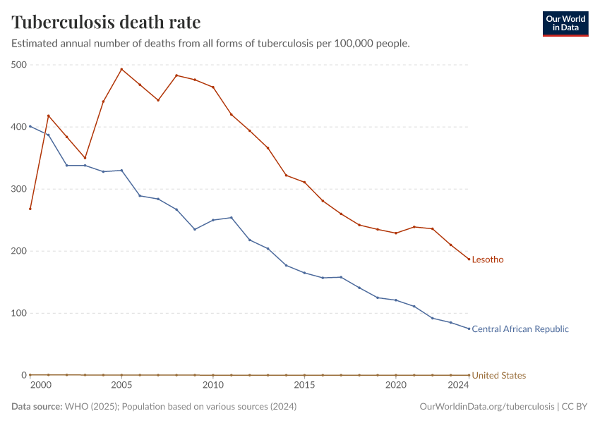 WHO (2024); Population based on various sources (2024) – with minor processing by Our World in Data. “Tuberculosis death rate” [dataset]. WHO, “Global Tuberculosis Report - Burden Estimates”; Various sources, “Population” [original data]. Retrieved January 9, 2026 from https://chrome-plugin.owid.pages.dev/grapher/tuberculosis-death-rate