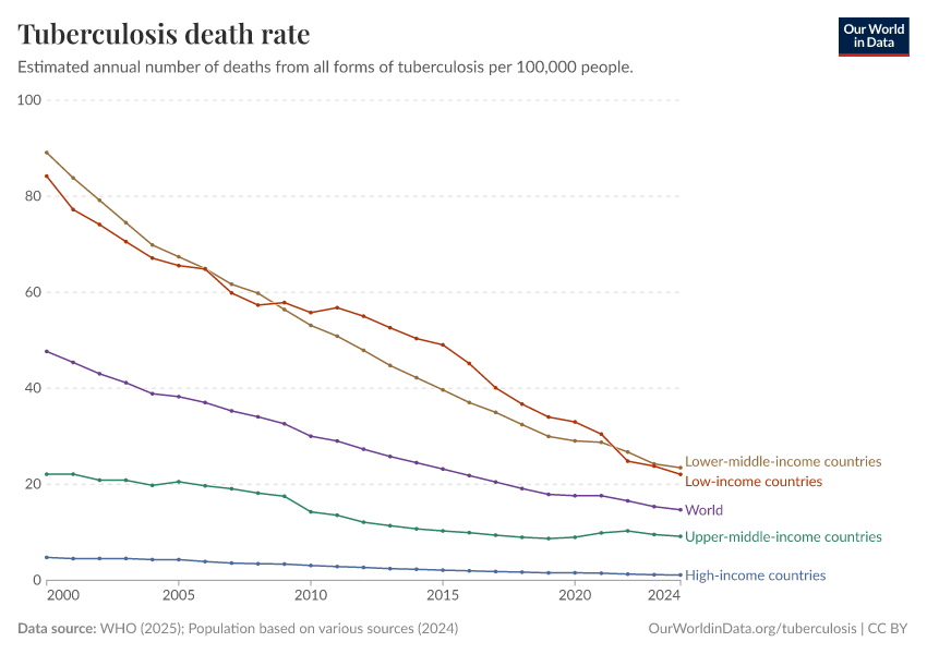 “Data Page: Tuberculosis death rate”, part of the following publication: Saloni Dattani, Fiona Spooner, Hannah Ritchie, and Max Roser (2023) - “Tuberculosis”. Data adapted from WHO, Various sources. Retrieved from https://chrome-plugin.owid.pages.dev/grapher/tuberculosis-death-rate [online resource]How to cite this data