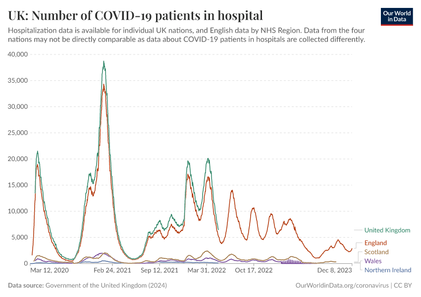 Government of the United Kingdom (2024) – with minor processing by Our World in Data. “UK: Number of COVID-19 patients in hospital” [dataset]. Government of the United Kingdom, “UKHSA data dashboard” [original data]. Retrieved January 9, 2026 from https://chrome-plugin.owid.pages.dev/grapher/uk-covid-hospital-patients