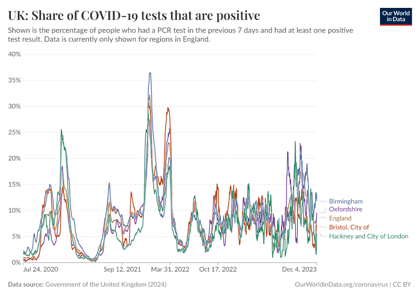 Government of the United Kingdom (2024) – with minor processing by Our World in Data. “UK: Share of COVID-19 tests that are positive” [dataset]. Government of the United Kingdom, “UKHSA data dashboard” [original data]. Retrieved January 9, 2026 from https://chrome-plugin.owid.pages.dev/grapher/uk-covid-positivity