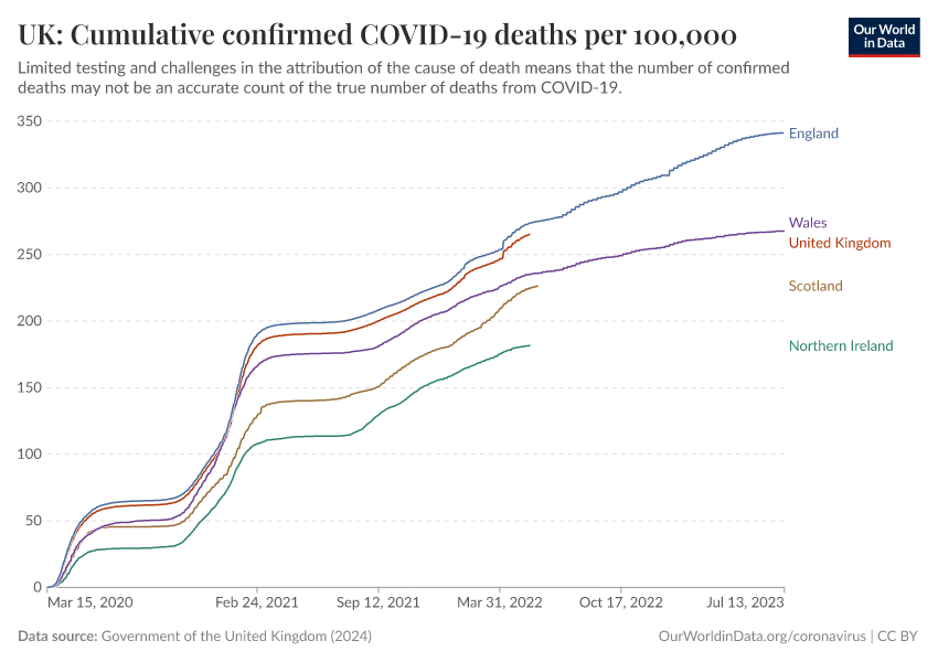 Government of the United Kingdom (2024) – with minor processing by Our World in Data. “UK: Cumulative confirmed COVID-19 deaths per 100,000” [dataset]. Government of the United Kingdom, “UKHSA data dashboard” [original data]. Retrieved January 9, 2026 from https://chrome-plugin.owid.pages.dev/grapher/uk-cumulative-covid-deaths-rate