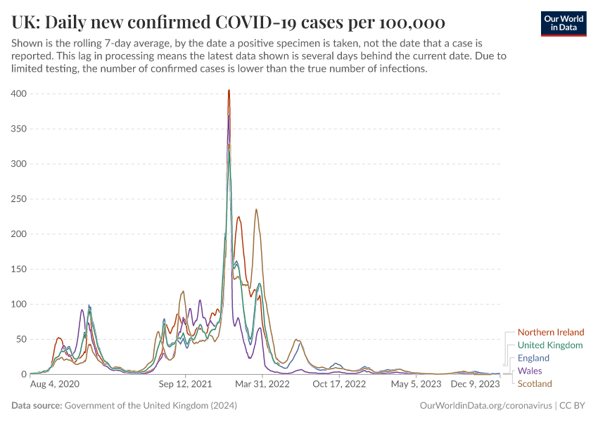 Government of the United Kingdom (2024) – with minor processing by Our World in Data. “UK: Daily new confirmed COVID-19 cases per 100,000” [dataset]. Government of the United Kingdom, “UKHSA data dashboard” [original data]. Retrieved January 9, 2026 from https://chrome-plugin.owid.pages.dev/grapher/uk-daily-covid-cases-7day-average