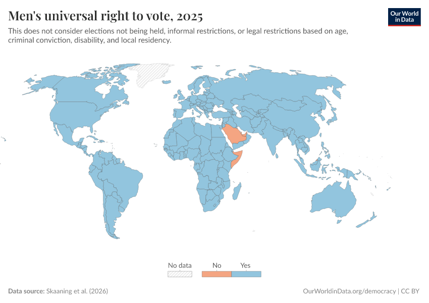 Skaaning et al. (2025) – processed by Our World in Data. “Men's universal right to vote” [dataset]. Skaaning et al., “Lexical Index of Electoral Democracy (LIED) v6.8” [original data]. Retrieved January 9, 2026 from https://chrome-plugin.owid.pages.dev/grapher/universal-suffrage-men-lexical