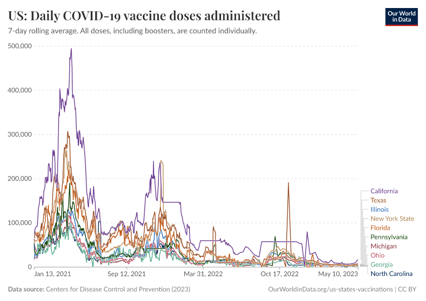 “Data Page: US: Daily COVID-19 vaccine doses administered”, part of the following publication: Edouard Mathieu, Hannah Ritchie, Lucas Rodés-Guirao, Cameron Appel, Daniel Gavrilov, Charlie Giattino, Joe Hasell, Bobbie Macdonald, Saloni Dattani, Diana Beltekian, Esteban Ortiz-Ospina, and Max Roser (2020) - “COVID-19 Pandemic”. Data adapted from Centers for Disease Control and Prevention. Retrieved from https://chrome-plugin.owid.pages.dev/grapher/us-daily-covid-vaccine-doses-administered [online resource]How to cite this data