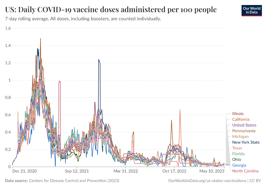 Centers for Disease Control and Prevention (2023) – processed by Our World in Data. “US: Daily COVID-19 vaccine doses administered per 100 people” [dataset]. Centers for Disease Control and Prevention, “COVID-19, Vaccinations (United States)” [original data]. Retrieved January 9, 2026 from https://chrome-plugin.owid.pages.dev/grapher/us-daily-covid-vaccine-doses-per-100