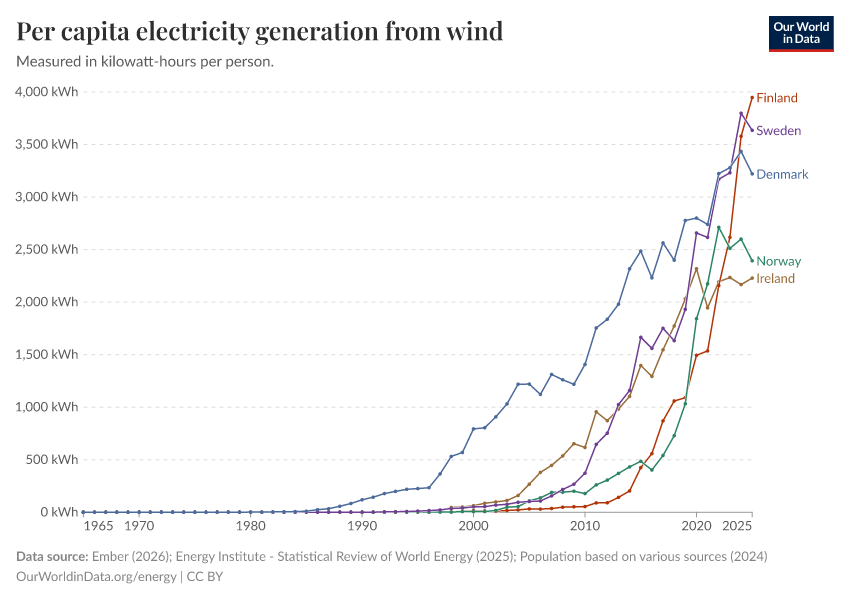Ember (2025); Energy Institute - Statistical Review of World Energy (2025); Population based on various sources (2024) – with major processing by Our World in Data. “Electricity generation from wind power per person” [dataset]. Ember, “Yearly Electricity Data Europe”; Ember, “Yearly Electricity Data”; Energy Institute, “Statistical Review of World Energy”; Various sources, “Population” [original data]. Retrieved January 9, 2026 from https://chrome-plugin.owid.pages.dev/grapher/wind-electricity-per-capita