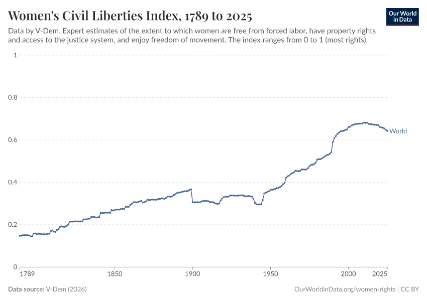 V-Dem (2025) – processed by Our World in Data. “Women's civil rights index – V-Dem” [dataset]. V-Dem, “Democracy report v15” [original data]. Retrieved January 9, 2026 from https://chrome-plugin.owid.pages.dev/grapher/women-civil-liberties-index